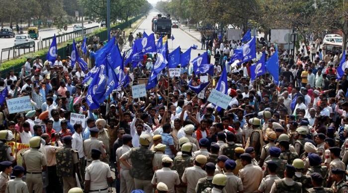 Police try to stop people belonging to the Dalit community as they take part in a protest during a nationwide strike. Photo: ReutersHundreds of Indian security forces enforced a curfew on a tense district Wednesday after a mob set fire to the homes...from GEO TV - World https://ift.tt/2ItXjBv